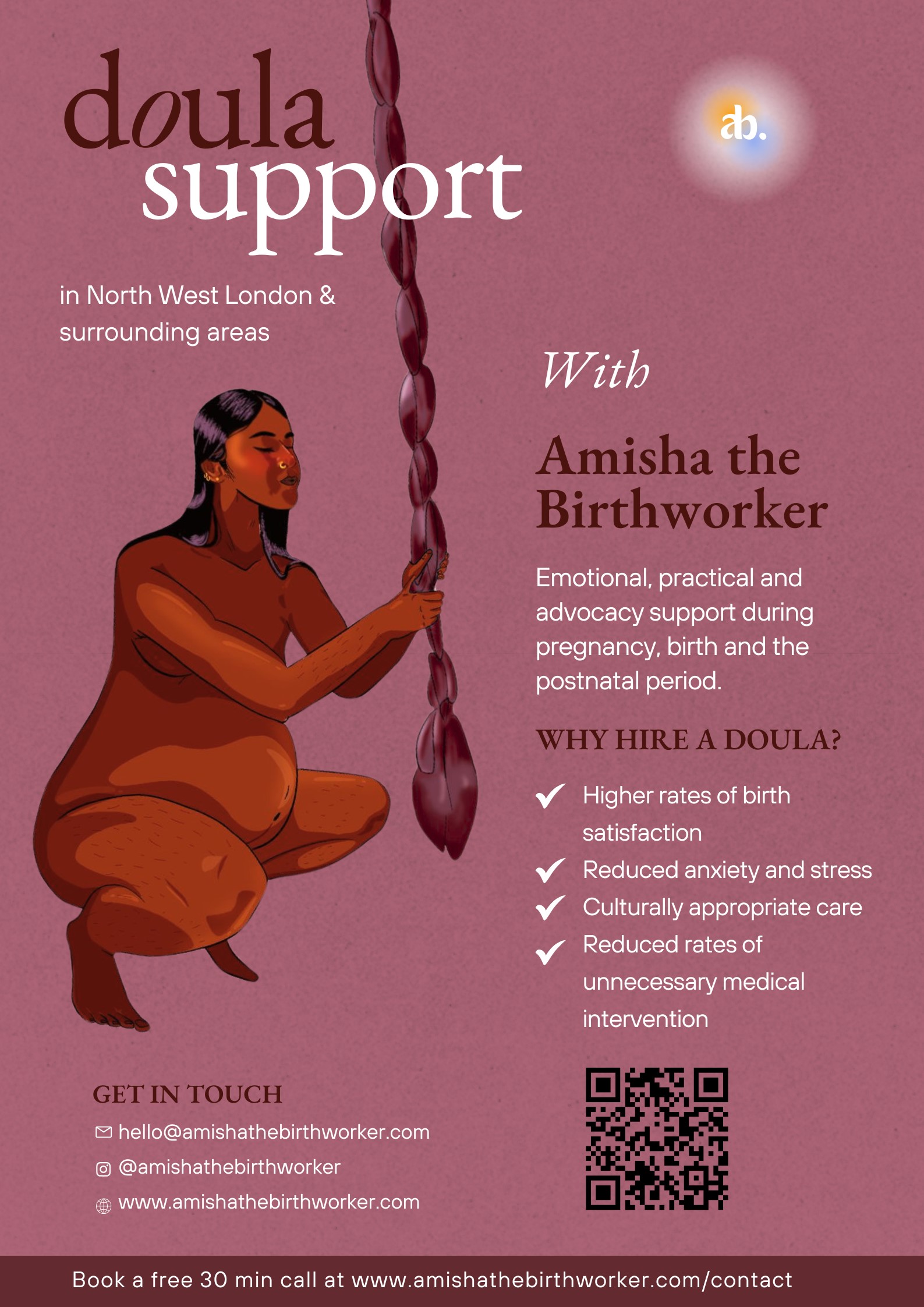 Amisha (they/she) is a doula based in London who has been practicing for 5 years. They offer individualised and trauma-informed care throughout pregnancy, birth and the postnatal period, prioritising the needs of queer and trans individuals often overlooked by the healthcare system.